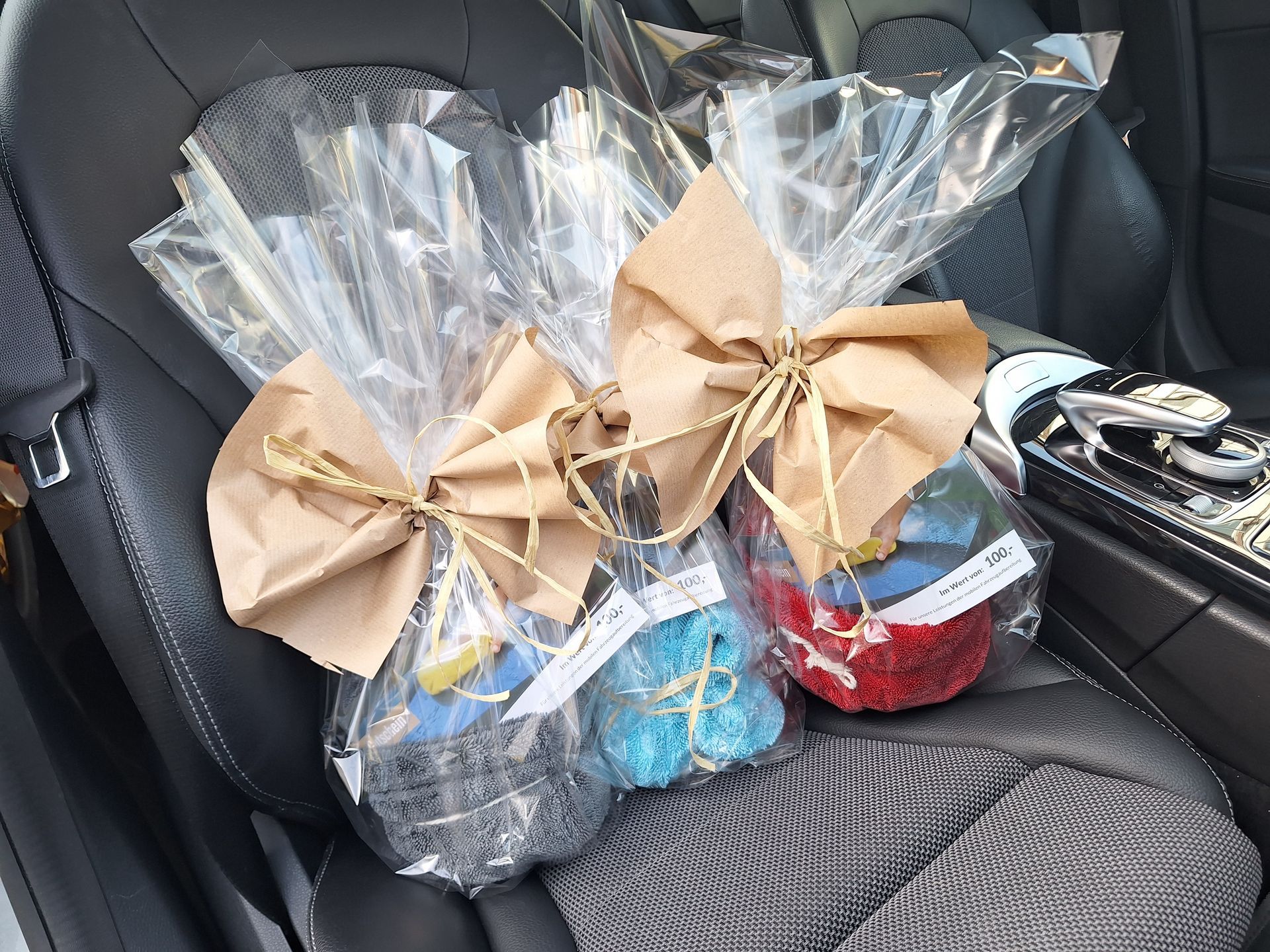 Die Gutscheine kommen als hochwertig bedruckte Karten mit einem Umschlag oder edel in Folie verpackt mit einem KFZ-Trocknungstuch.